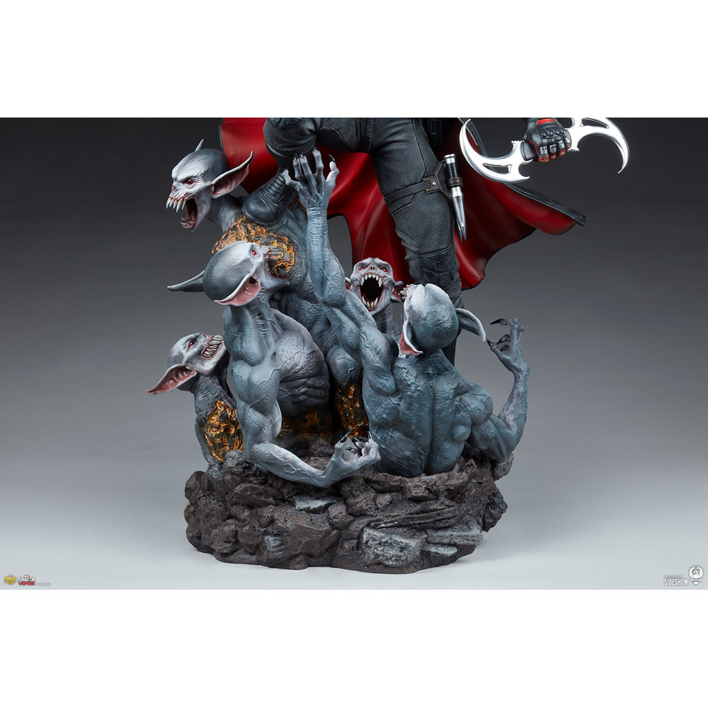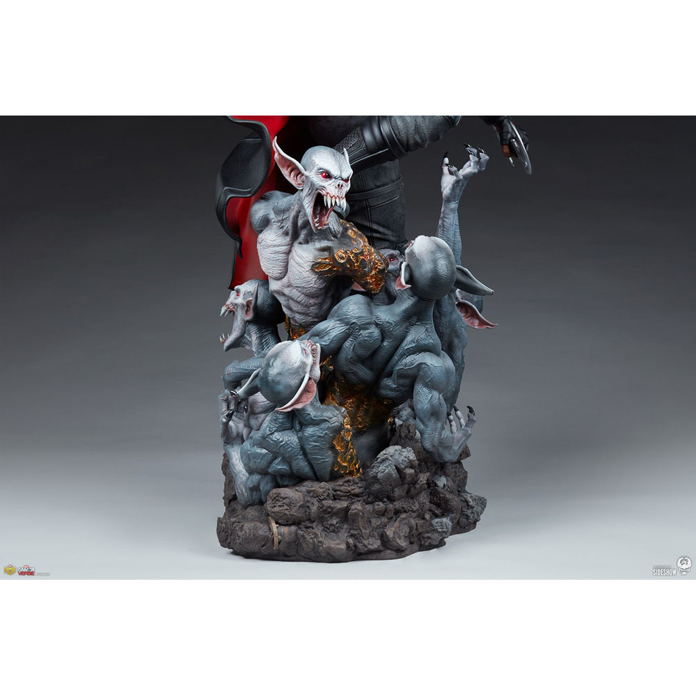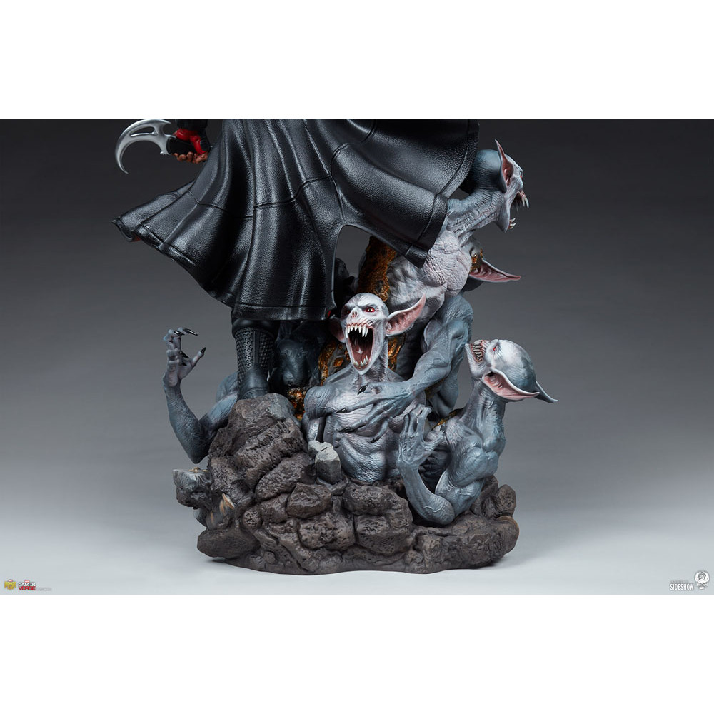 La statue lui donne un look qui se rapproche beaucoup de l’incarnation cinema de Wesley Snipes ce qui ne devrait pas deplaire aux fans, superbement sculptée et massive elle embarque en plus une seconde tête pour le Dhampir.