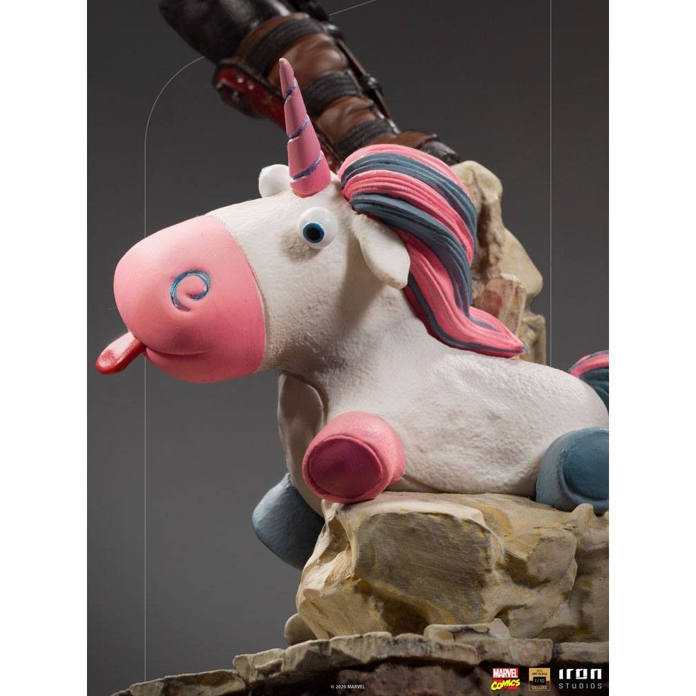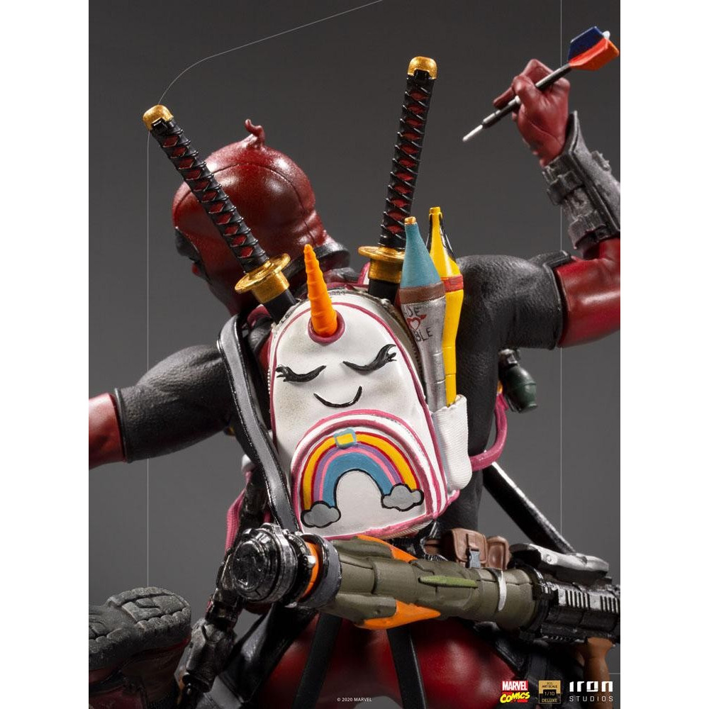Deadpool est ici representé dans toute sa flamboyante betise, duckface, sac a dos et peluche licorne, flechette en main, bazooka sur l’epaule et katanas dans le dos, pose debile, il est parfait 🙂