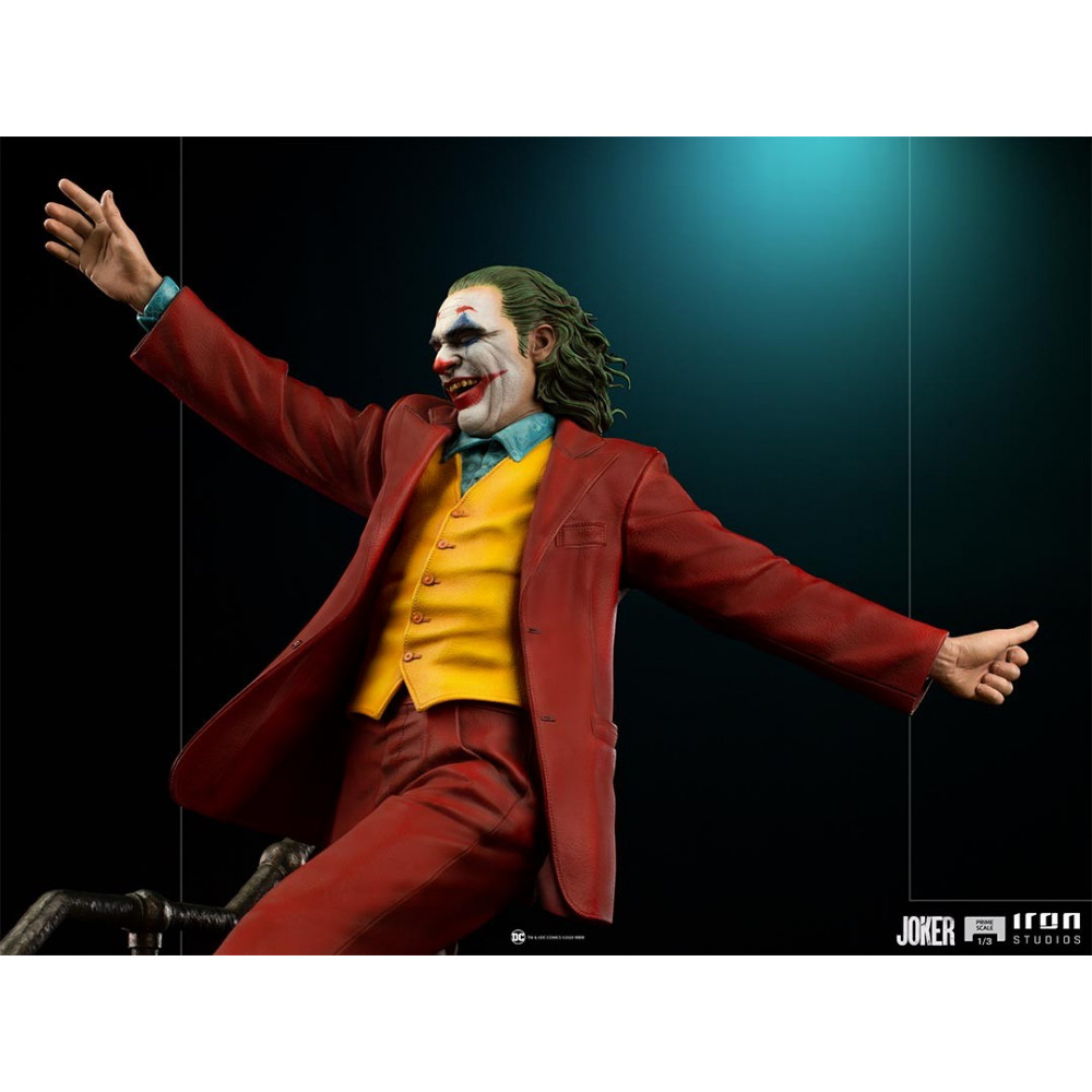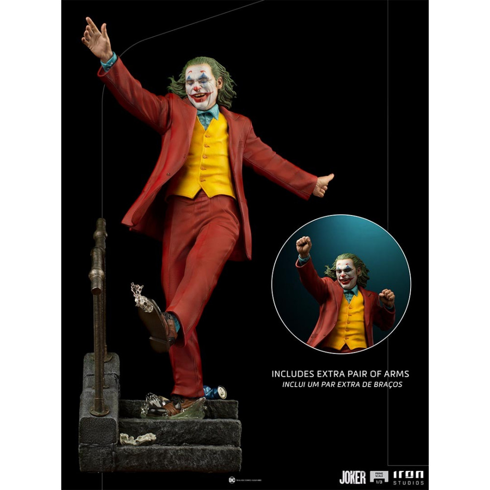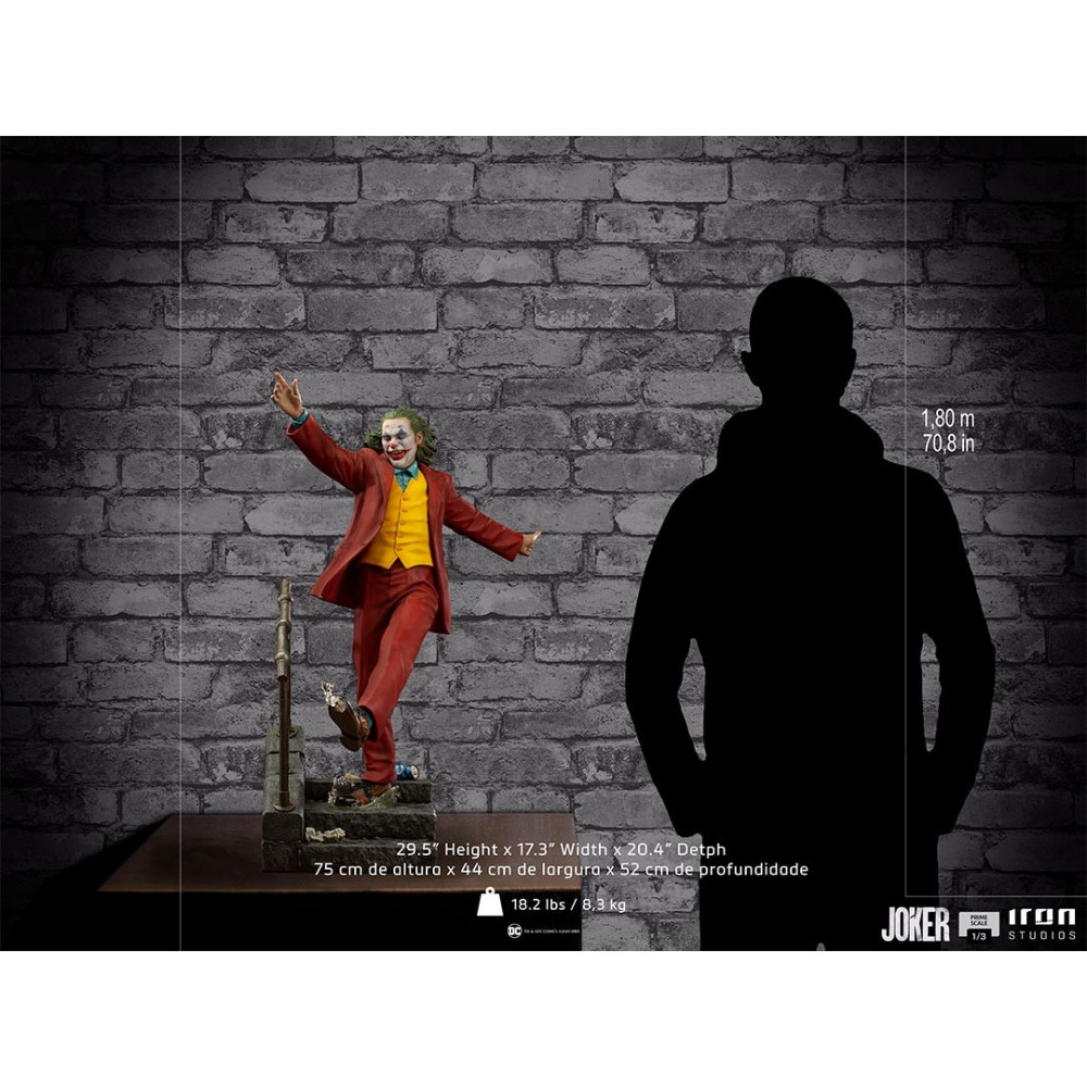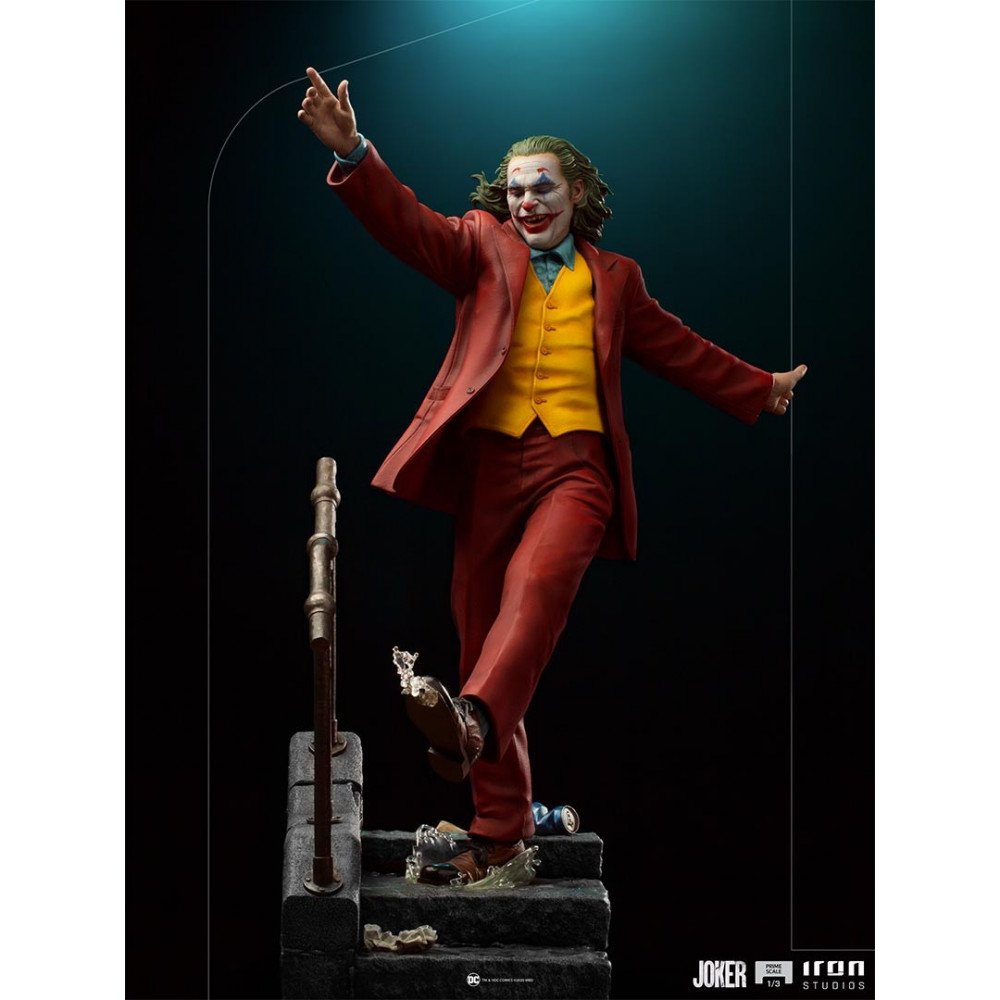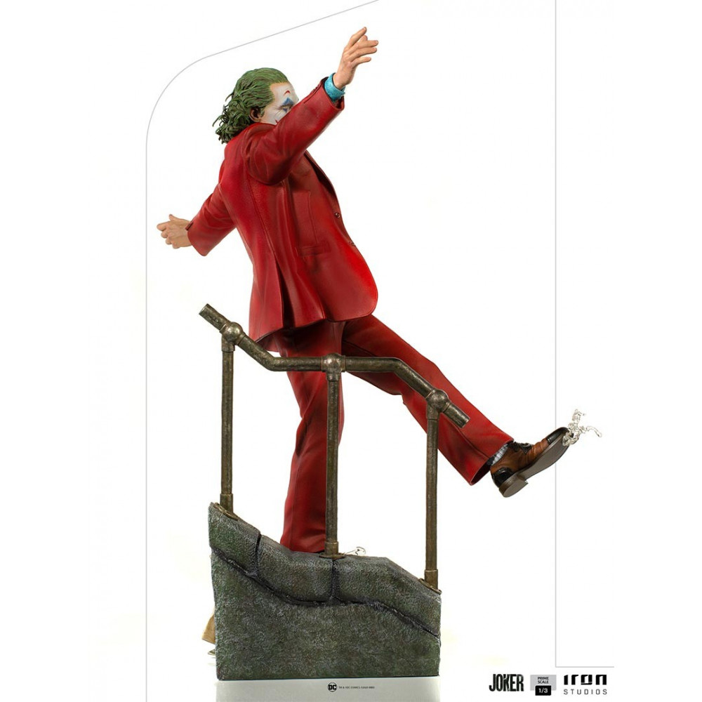 Version du joker echelle 1/3 produite par Iron studios dans une pose très représentative du joker dansant dans les escaliers