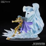 Camus est représenté en pleine exécution de l’Aurora Execution, sa technique ultime capable de figer même le temps. Son armure d’or resplendit de reflets métalliques froids, détaillée jusqu’aux symboles du Verseau. Son visage, impassible et concentré, exprime la maîtrise parfaite de son cosmos glacial.