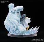 Le socle, sculpté à l’image d’un sol polaire fissuré, est entouré d’effets de glace en résine translucide, avec des colonnes de givre, cristaux gelés, ou des vagues de froid stylisées, évoquant l’ambiance glaciale du Temple du Verseau.