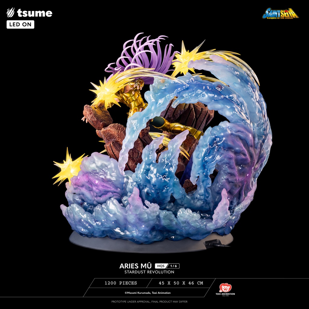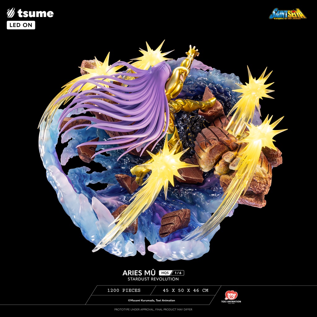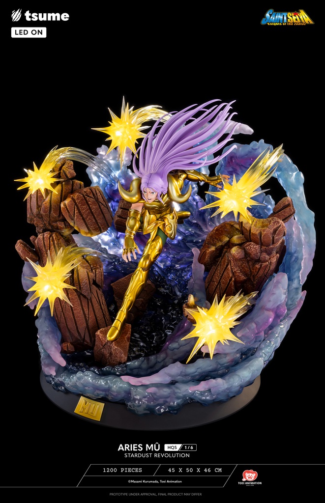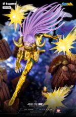 Découvrez Aries Mû, le Chevalier d’Or du Bélier, lançant sa mythique Stardust Revolution dans cette statue HQS 1/6 à la puissance cosmique éclatante.
