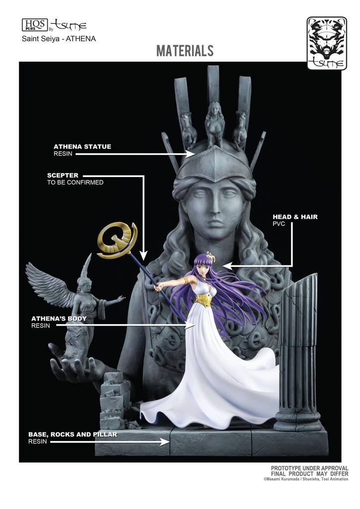 Le socle richement orné représente les Colonnes du Sanctuaire, des symboles d’oracles, ou le trône d’Athena, avec des effets lumineux subtils en résine translucide. L’aura de lumière autour d’elle illustre parfaitement son statut de déesse protectrice opposée aux forces du mal comme Hadès, Poséidon ou Arès.