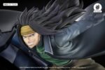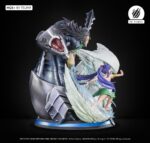 Les effets magiques en résine translucide illustrent leurs éléments respectifs : pointe d’acier acérée, vortex de vent, et halos curatifs. Le socle, finement sculpté, évoque un champ de bataille ou les ruines d’un lieu emblématique de Fairy Tail, renforçant le réalisme et l’impact dramatique de la scène.