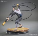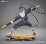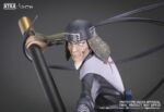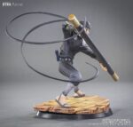 La sculpture le montre dans une pose de combat dynamique, vêtu de son armure traditionnelle, formant des mudras ou maniant le bâton d’Enma dans une scène d’action saisissante. Le visage sérieux et concentré, les détails des plis du costume, et les effets de chakra ou de poussière ajoutent une forte tension dramatique à la scène.