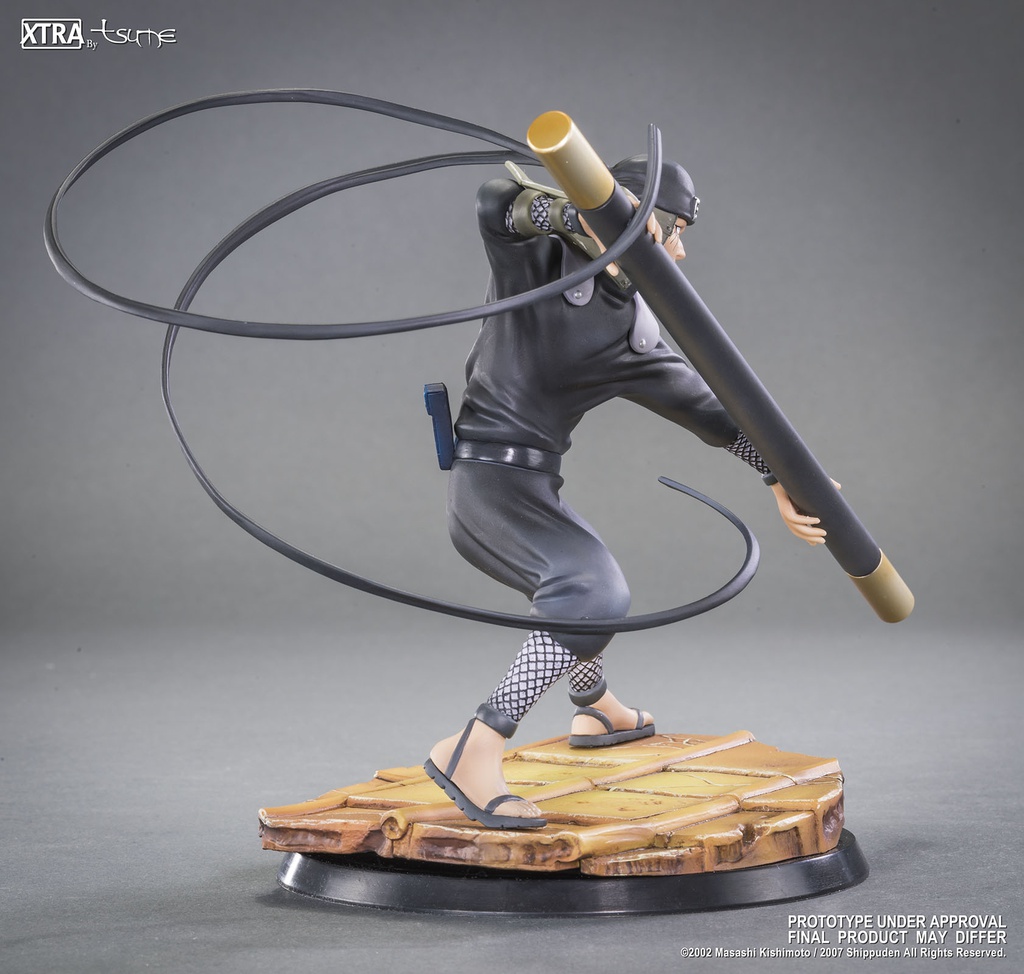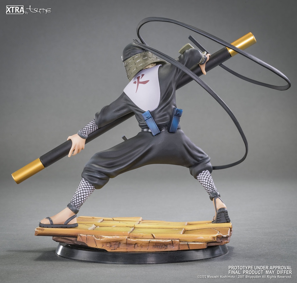 Le socle évoque le toit de la salle des Hokage, un champ de bataille ou un morceau de Konoha en ruine, avec des fragments de tuiles, des kunais plantés au sol, et parfois des sculptures des visages Hokage en arrière-plan.