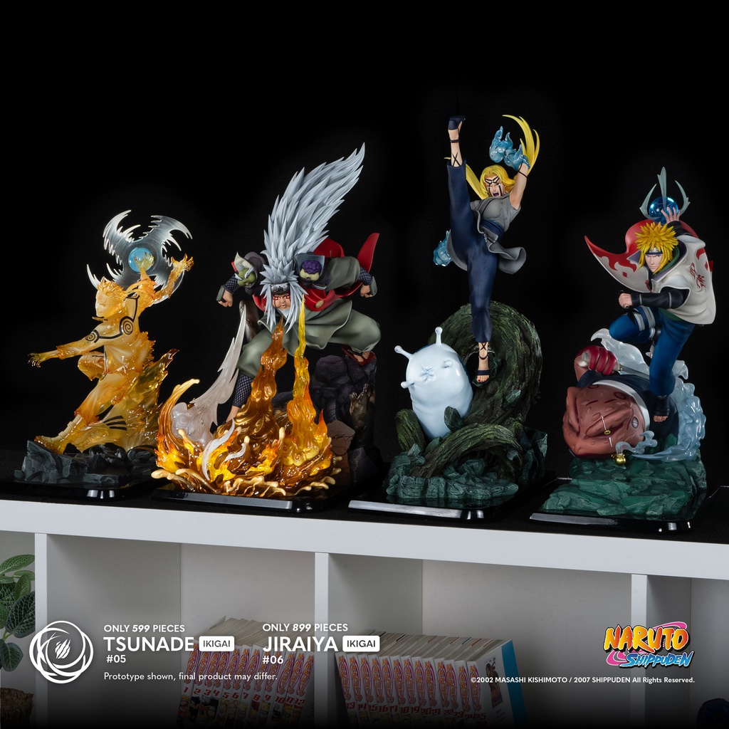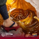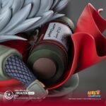 La sculpture dépeint Jiraiya dans une pose dynamique et confiante, en pleine invocation ou lancement de jutsu, avec son célèbre rouleau ninja, sa longue chevelure blanche, et son manteau rouge flottant au vent. Le socle reprend des éléments du village de Konoha ou du Mont Myôboku selon la version, avec des effets de fumée, de roches ou d’eau.