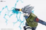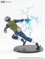 La sculpture le montre dans une pose élégante et concentrée, masque relevé sur un œil, Sharingan activé, main droite canalise l’énergie du Chidori, prêt à lancer son coup emblématique. Ses vêtements — gilet de jōnin, pantalon, protège-bras et bandeau frontal avec le symbole de Konoha — sont finement sculptés pour reproduire chaque détail du ninja copieur.