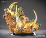 Le socle, inspiré du champ de bataille de la Terre, est décoré de fragments rocheux, ondes d’impact et explosions stylisées en résine translucide. L’effet de mouvement est renforcé par les traînées d’énergie, les poses acrobatiques des ennemis et les lignes de force sculptées dans l’environnement.