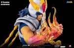La statue met en avant le moment de résurrection du Phénix, avec des flammes sculptées en résine translucide s’élevant autour de lui, formant l’aura du mythique oiseau. Son armure du Phénix, riche en détails, brille de reflets métalliques orange et rouge, fidèle à l’anime. Son regard déterminé et sa posture martiale renforcent la puissance de la scène.