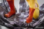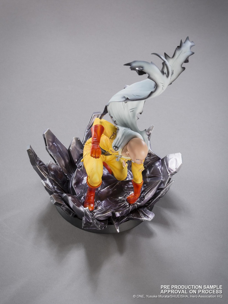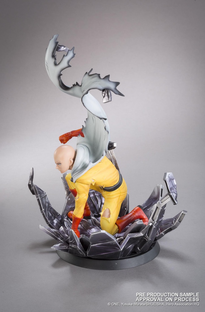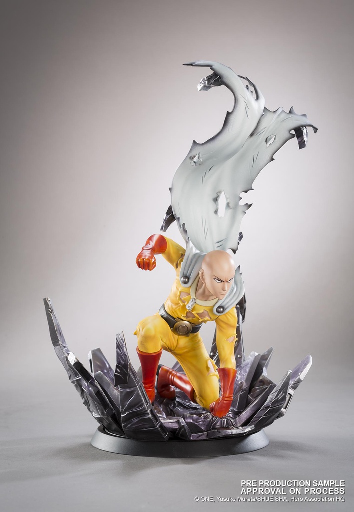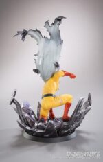 Vêtu de sa tenue jaune avec cape blanche flottante, Saitama est sculpté avec précision, dans une posture d’attaque ou d’impact, le point en avant, le regard déterminé… ou vide d’émotion, fidèle à son caractère absurde. Les effets d’onde de choc ou de sol brisé sous ses pieds renforcent le contraste entre sa banalité apparente et la puissance cosmique qu’il incarne.