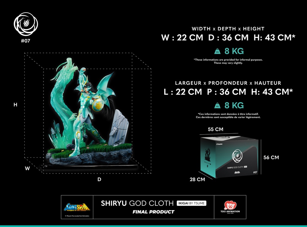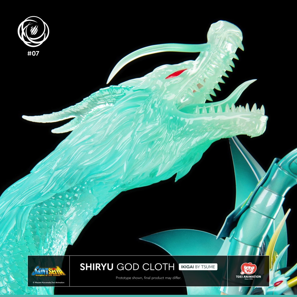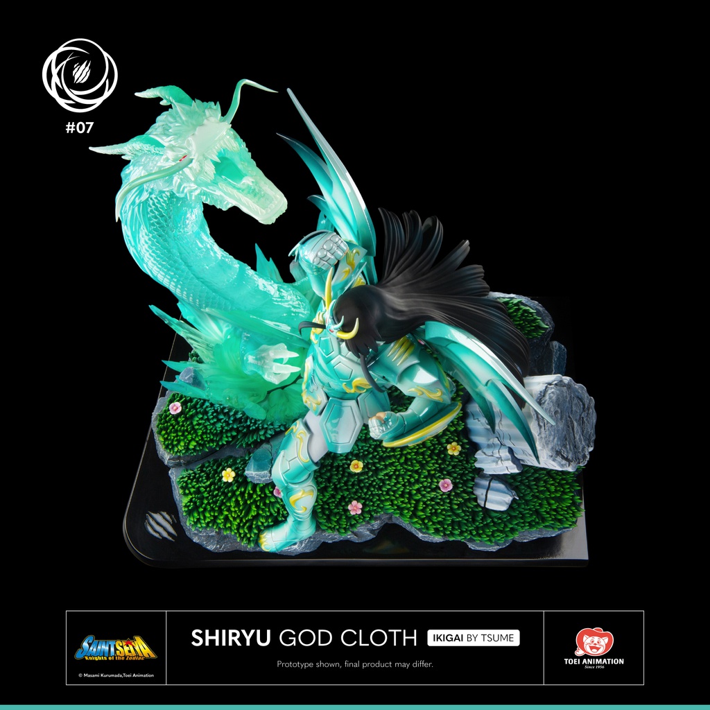 La God Cloth du Dragon, sculptée avec un niveau de détail exceptionnel, brille de ses reflets argentés et dorés, avec ses ailes déployées et ses symboles draconiques magnifiquement mis en valeur. La pose de Shiryu, droite et déterminée, évoque sa fidélité à Athéna et sa maîtrise du Rozan Shō Ryū Ha (Colère du Dragon).