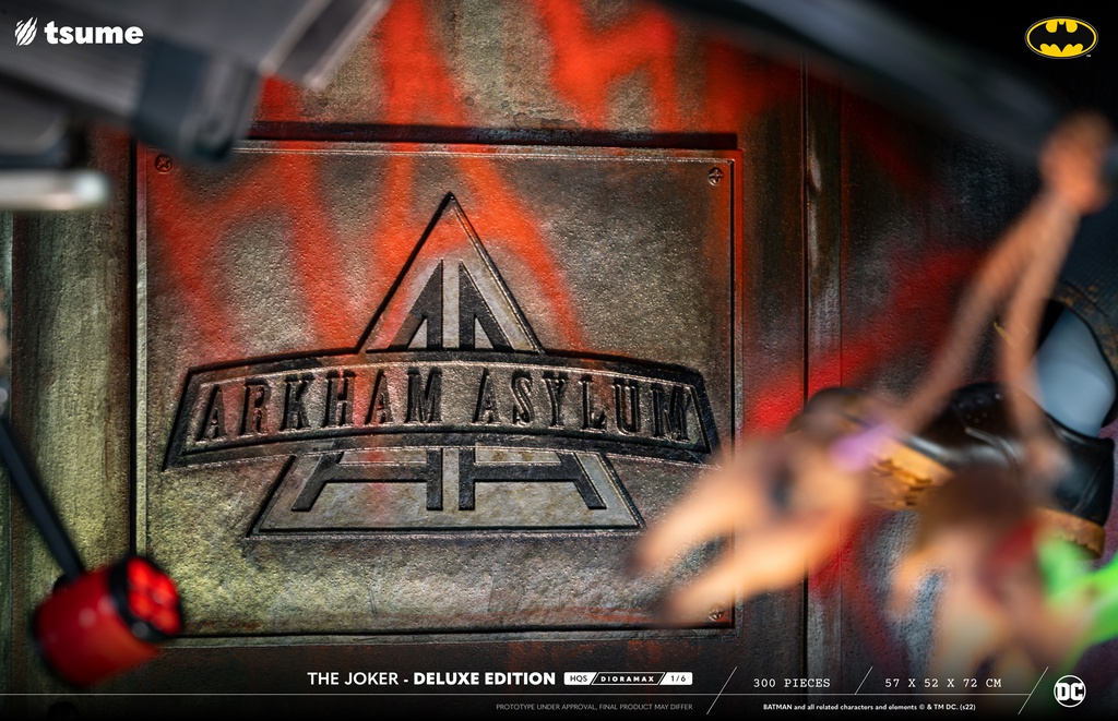 Le socle Deluxe, travaillé comme une véritable scène de crime, intègre des éléments 3D exclusifs : marionnettes, masques de clowns, tags “HA HA HA”, et même parfois une tête d’ennemi vaincu, pour accentuer le côté dérangeant de la pièce. Le visage peut être interchangeable (rire dément, sérieux glacial, ou version ensanglantée selon les éditions).
