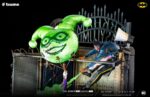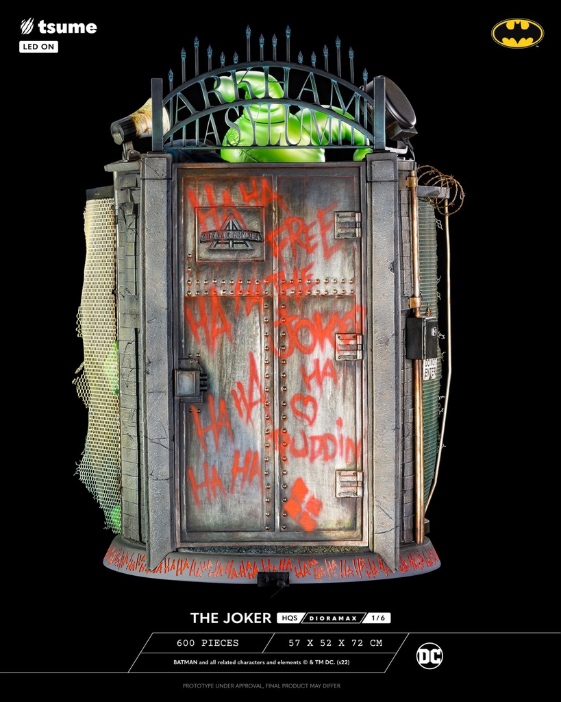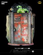 Le socle Dioramax met en scène l’univers psychotique du personnage avec des éléments comme des rires sculptés (“HA HA HA”), des effets de lumière, ou des accessoires sanglants (masques, cartes, dynamite).